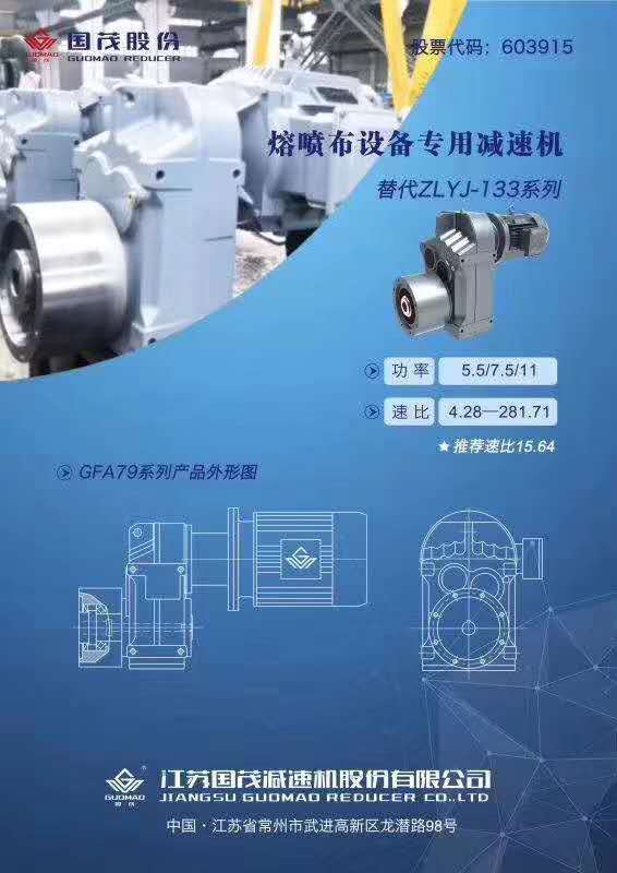 熔噴布擠出機(jī)減速機(jī), 熔噴布專(zhuān)用減速機(jī),熔噴布設(shè)備專(zhuān)用減速機(jī),江蘇國(guó)茂減速機(jī),全國(guó)名牌,品質(zhì)保證,有合格證,替代ZLYJ-133系列,適用于50型熔噴布擠出機(jī)。聯(lián)系電話:13921098089